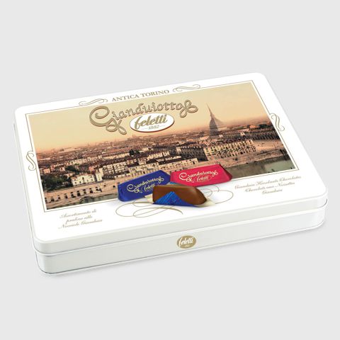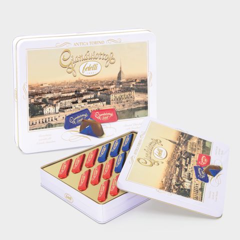 Questa prestigiosa latta riporta un'immagine decorata a rilievi della Torino antica. Al suo interno il nostro più tradizionale degli assortimenti. Il famoso Gianduiotto Blu, classico con il 32% di nocciole e il Gianduiotto Rosso, fondente deciso con il 25% di nocciole.