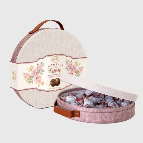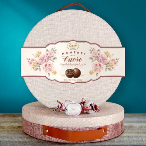 La Scatola Michelle è una graziosa e utile valigetta rivestita in tessuto che contiene deliziose praline di cioccolato al latte ripiene di crema al cacao e granella di cacao caramellata. Sorprendi i tuoi cari con un dono unico e delizioso.